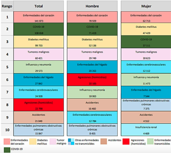 De acuerdo con el Instituto Nacional de Estadística y Geografía (Inegi), al corte de agosto de 2020, el COVID-19 se convirtió en la segunda causa de muerte en México para hombres y la tercera para mujeres, sólo por debajo de las enfermedades del corazón. Además, datos del instituto arrojan que entre enero y agosto de 2020 hubo más muertos por COVID-19 de los que tiene registro la Secretaría de Salud.
