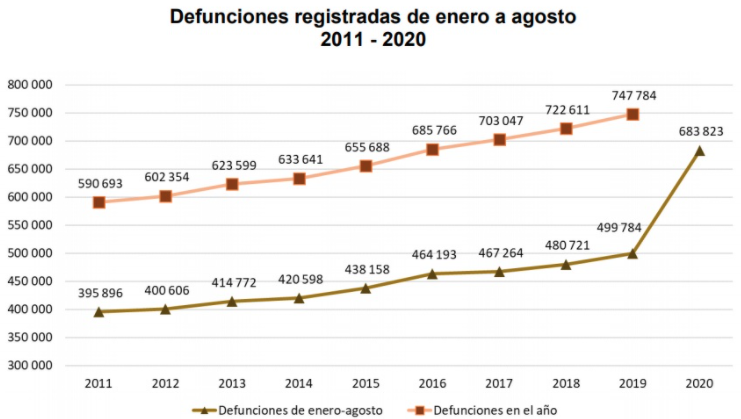 El número total de muertes entre enero y agosto de 2020 es de 683 mil 823 casos, lo que son 184 mil 039 muertes más que las que hubo en el mismo periodo, pero de 2019. Inegi aseguró que de enero a agosto de 2020 hubo un “exceso de mortalidad” en el país y las entidades con mayor número de muertes son Estado de México, Ciudad de México, Veracruz y Jalisco.