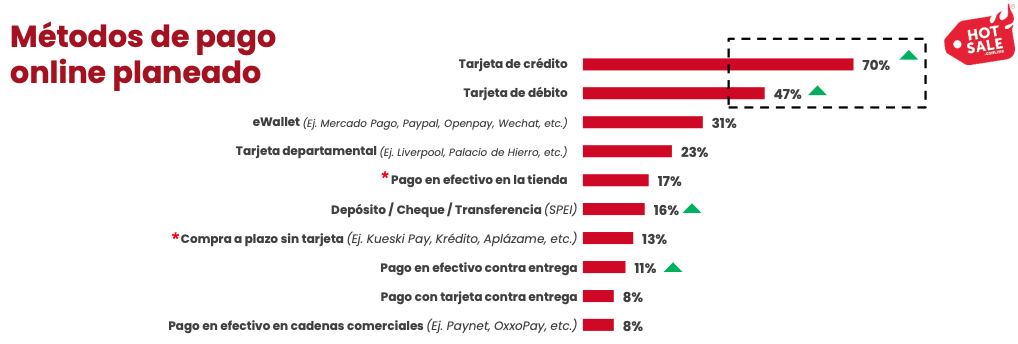Respecto a los montos que desean gastar, siete de cada 10 consumidores han asegurado que van a gastar igual o más que en otras ediciones del Hot Sale. Los principales métodos de pago son las tarjetas de crédito y débito, mientras que los depósitos, cheques y transferencias han aumentado su uso durante los últimos años.