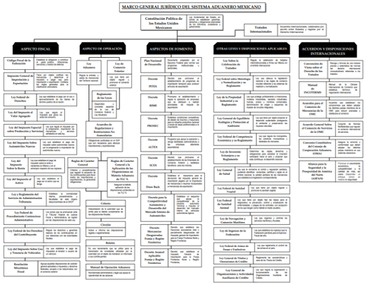 El Bufete Internacional de Consultores y Abogados elaboró un diagrama de flujo del marco general jurídico del sistema aduanero mexicano en el que además de la Constitución se muestran diversos ordenamientos en los que se basa el funcionamiento de las aduanas de México, y que tiene que ver con el aspecto fiscal, de operación, de fomento, así como acuerdos y disposiciones internacionales que con el tiempo se han ido ampliando y transformado.