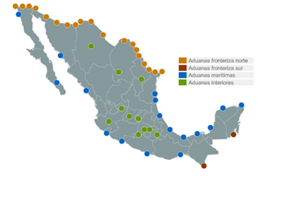 México tiene 49 aduanas que son de cuatro tipos: marítimas, terrestres (fronterizas), aéreas e interiores.19 se ubican en la frontera norte, dos en la frontera sur, 17 son aduanas marinas y 11 don aduanas interiores.