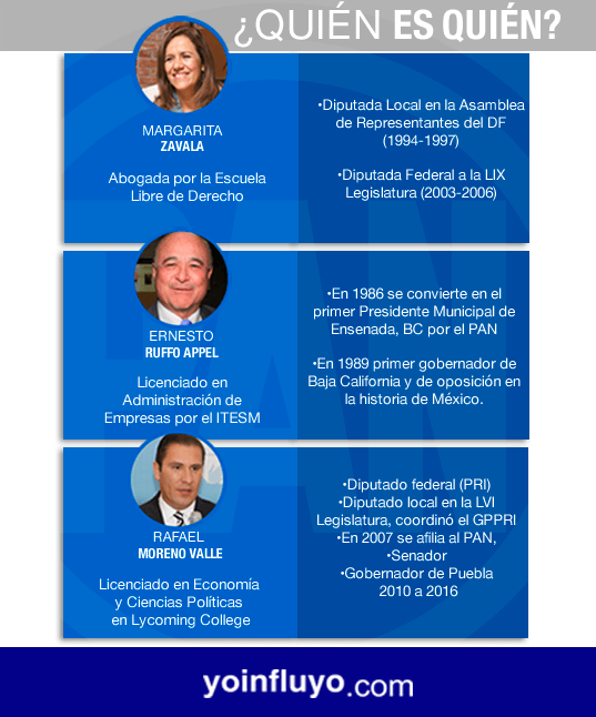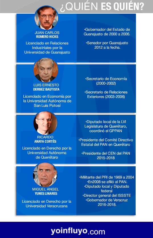 Los de la lista azul son: Margarita Zavala, Ernesto Ruffo Appel, Rafael Moreno Valle, Juan Carlos Romero Hicks, Luis Ernesto Derbez, Ricardo Anaya y Miguel Ángel Yunes. De todos ellos los que más tiempo han estado en la palestra son Zavala, Anaya y Moreno Valle.