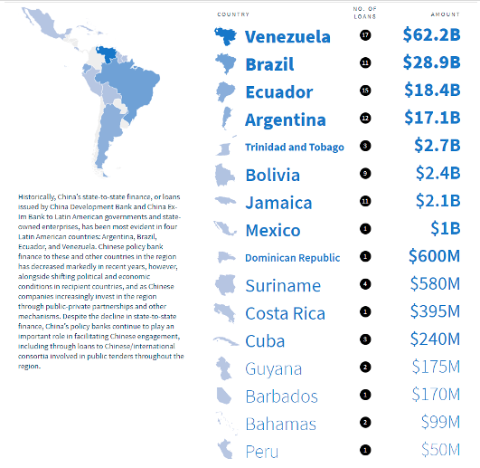 Y según la base de datos de finanzas de China y América Latina publicada por el centro de análisis Diálogo Interamericano, México es el octavo país latinoamericano y del Caribe que más endeudado está con el gigante asiático.