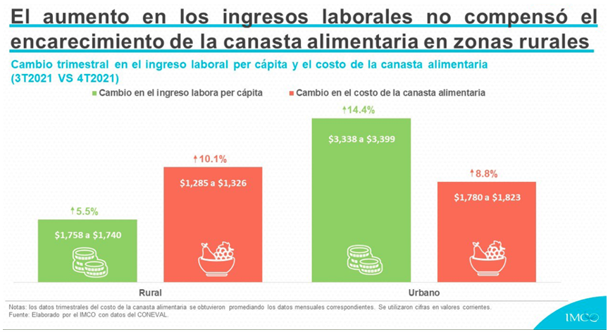 En las zonas rurales aumentaron los ingresos laborales, pero el incremento presentado no fue suficiente para compensar el encarecimiento de la canasta básica alimentaria. En el último cuatrimestre de 2021 hubo un aumento de 5.5 por ciento en el ingreso laboral per cápita (que equivale de mil 758 a mil 740 pesos), mientras que la canasta básica incrementó 10.1 por ciento, equivalente a mil 326 pesos aproximadamente.