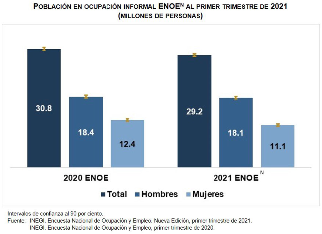 En lo que respecta a la ocupación informal según el sexo, muestra en los hombres una contracción de 285 mil personas al registrarse 18.4 millones en el primer trimestre de 2020 y 18.1 millones en el primer trimestre de 2021; dicho descenso fue de 437 mil ocupados menos fuera del sector informal. Mientras que en el caso de las mujeres disminuyeron en 1.3 millones en el mismo periodo al pasar de 12.4 millones a 11.1 millones.