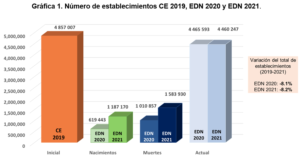 El EDN 2021 estimó que nacieron 1.2 millones y cerraron 1.6 millones, lo que significa que entre octubre de 2020 y julio 2021, se incrementó la proporción de nacimientos y disminuyó la proporción de muertes en comparación con lo observado de mayo de 2019 a septiembre de 2020.