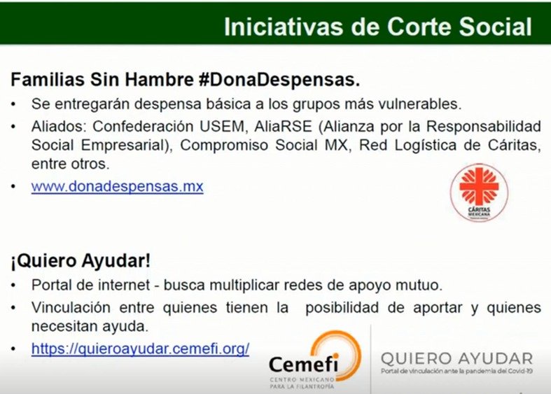 Durante la videoconferencia, siete mil representantes de diversos sectores productivos del país, algunos integrantes del CCE dieron a conocer acciones concretas que ya han puesto en marcha tanto en las empresas como uniendo esfuerzos con organizaciones civiles para apoyar a los sectores más vulnerables quienes debido al cierre de empresas quedaron sin trabajo o han visto disminuida su capacidad para adquirir artículos de primera necesidad.