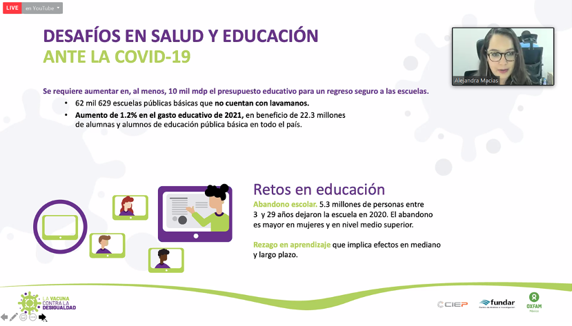 En su participación, Alejandra Macías, directora de investigación del CIEP, dijo que los dos rubros más afectados en el país a consecuencia de la pandemia fueron el de salud y el de educación, mientras que los grupos que fueron más golpeados fueron las mujeres y jóvenes.