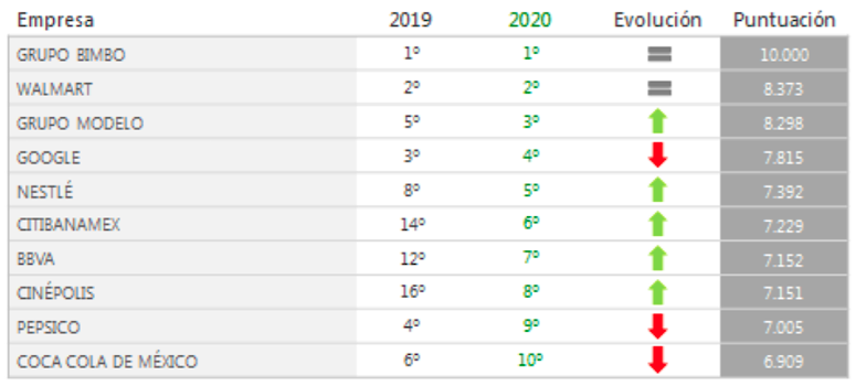 En la octava edición del ranking Responsabilidad Social y Gobierno Corporativo en México en 2020, las 10 empresas que lideran esta lista son: Grupo Bimbo, Walmart, Grupo Modelo, Google, Nestlé, Citibanamex, BBVA, Cinépolis, Pepsico y Coca Cola de México.