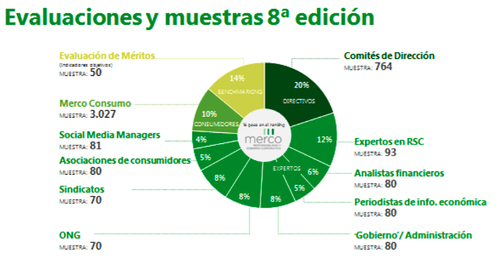 En la edición correspondiente a 2020, participaron 764 directivos de grandes empresas, 80 periodistas de información económica, 80 miembros de gobierno, 93 expertos en Responsabilidad Social Corporativa, 80 analistas financieros, 81 social media managers, 70 responsables de ONG, 70 sindicatos y 80 responsables de asociaciones de consumidores, así como 3.027 ciudadanos (Merco Consumo). Además, junto a estas evaluaciones se consideró la realidad de estas por medio de una evaluación de méritos reputacionales por parte de 50 empresas.