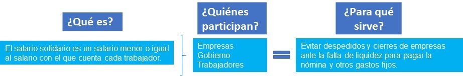 La propuesta de salarios solidarios consiste en que durante el periodo de emergencia, el presidente de México autorice recursos extraordinarios financiados de los impuestos que los ciudadanos pagan, para que una parte de los salarios se cubra por parte de la federación, haciendo mucho más accesible para muchas empresas seguir operando y pagando a sus empleados, sin tener que recurrir a recortes o cierres definitivos.