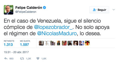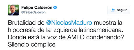 El ex presidente, Felipe Calderón Hinojosa, condenó el silencio de Andrés Manuel López Obrador frente a los violentos acontecimientos que se han vivido los últimos días en Venezuela.