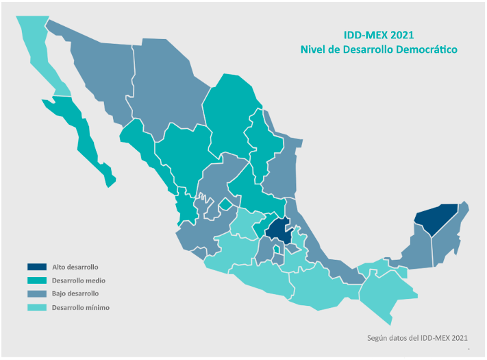 El IDD-Mex 2021 señala que hubo heterogeneidad en algunas de las regiones geográficas con respecto a la intensidad de desarrollo democrático. En la Región Norte hay sólo un estado con mínimo desarrollo democrático: Baja California, en los estados con alto desarrollo únicamente se ubican en dos regiones, en la Centro (Hidalgo) y Sureste (Yucatán).