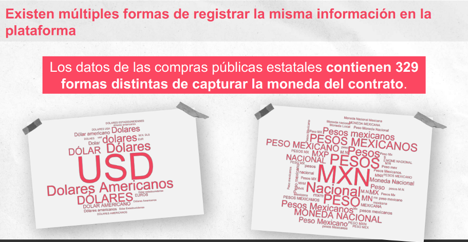 Existe falta de homologación de los datos, ya que hay múltiples formas de registrar la misma información; “tan solo para hacer referencia al fundamento legal de los contratos, los estados utilizaron mil 849 formas distintas de captura. Asimismo, las instituciones registraron el tipo de moneda de 329 formas distintas en la PNT”.