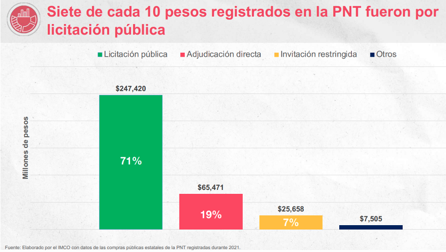 De acuerdo al estudio Compras públicas estatales: ¿Dónde quedaron los datos?, el Imco analizó 251 mil 148 procesos de compra por un monto de 346 mil millones de pesos realizados durante 2021 por las instituciones estatales de los 32 estados del país disponibles en la plataforma en la que encontró diversas ineficiencias que limita el acceso a la información.