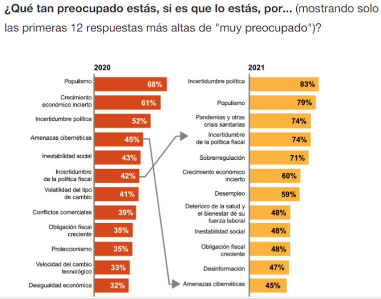 En general, en tan sólo un año, la mayor preocupación de los CEO para invertir se disparó en todos los factores considerados en una encuesta que se realizó a diversos directivos. Así, por ejemplo, en comparación con un año atrás, la incertidumbre política se incrementó considerablemente al pasar de 52 por ciento el año pasado a 83 por ciento en 2021. Por otra parte, el populismo aumentó considerablemente, pues mientras que en 2020 el porcentaje que presentaba era de 68 por ciento, este año es de 79 por ciento.