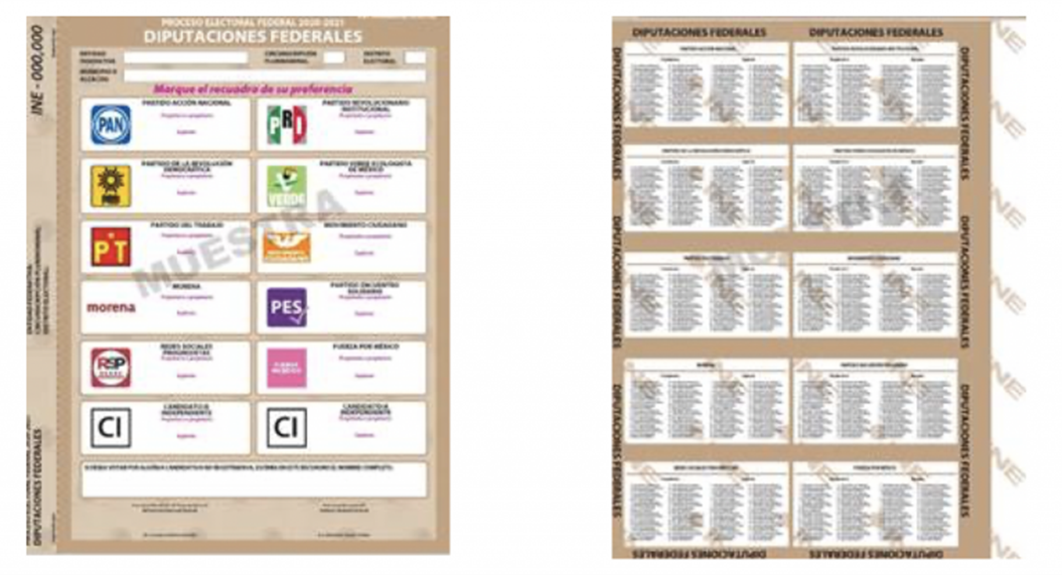 El formato considera un total de 10 partidos políticos y dos espacios para candidatos independientes, divididos en dos columnas, donde los emblemas irregulares se ubican en la sección central, lo que de acuerdo con el estudio realizado por la Universidad Autónoma Metropolitana (UAM) puede generar efecto óptico de semejanza mientras que la distribución específica en tercios logra uno de simetría.