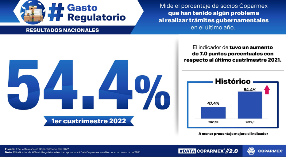 En cuanto al indicador Gasto Regulatorio, Medina Mora Icaza dijo que el 54.4 por ciento, más de la mitad de los socios Coparmex, externaron que han experimentado algún problema al realizar trámites gubernamentales, siendo los requisitos excesivos y la falta de claridad los principales problemas que han enfrentado.