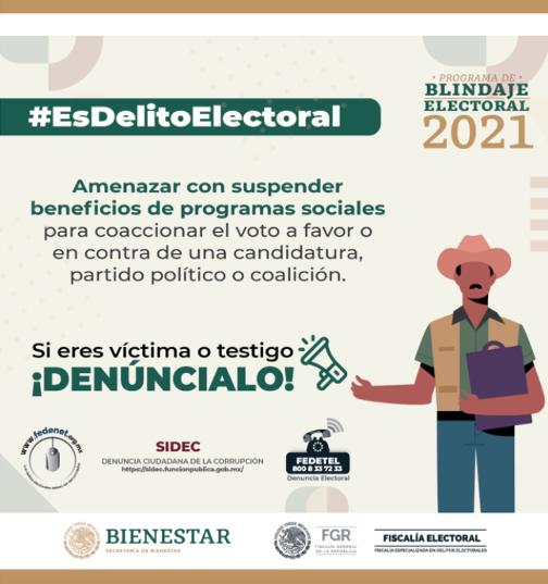 Para garantizar que los funcionarios públicos actúen con imparcialidad y neutralidad durante el proceso electoral en marcha, además de ofrecer a la ciudadanía información sobre cuáles son y cómo denunciar los delitos electorales y las consecuencias que generan los mismos, la Secretaría de Bienestar emitió sus lineamientos generales del Programa de Blindaje Electoral 2021.