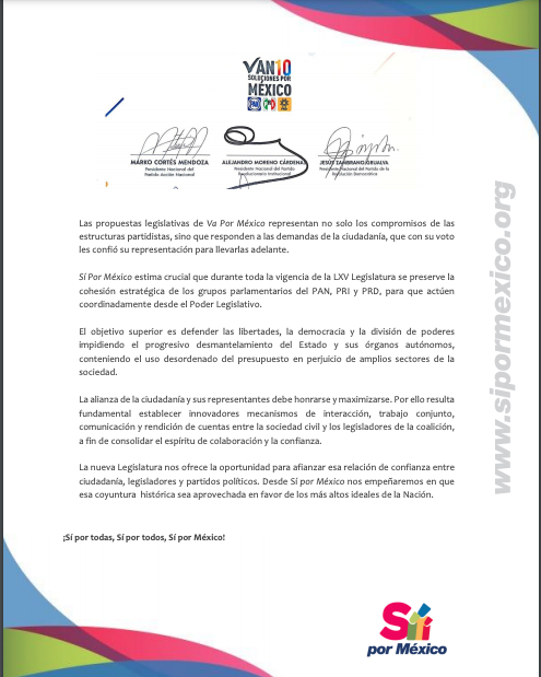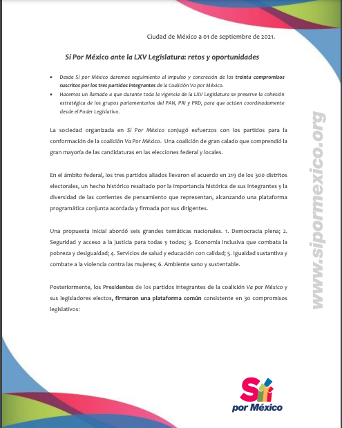 Sí por México exhorta a los legisladores de la coalición Va por México y de Movimiento Ciudadano a promover la acción de inconstitucionalidad en contra de aspectos de la Ley Federal de Revocación de Mandato contrarios al espíritu y letra de la Carta Magna. Además de que impulsará, desde la sociedad civil, procesos judiciales para garantizar la enmienda de los desaciertos legislativos al regular el derecho ciudadano a la revocación del mandato con vistas a procesos futuros.