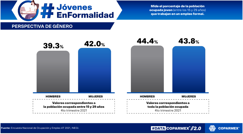 Señaló que en el cuarto trimestre de 2021 entre la población de 15 a 29 años, el porcentaje de hombres con empleo ascendió a 39.3 por ciento y el de las mujeres a 42 por ciento, sin embargo, al considerar a toda la población ocupada los hombres con empleo sumaron 44.4 por ciento en tanto que el empleo para las mujeres fue menor al colocarse en 43.8 por ciento, lo que aseguró que es un indicativo que entre más años tienen las mujeres las oportunidades son menores para ellas.