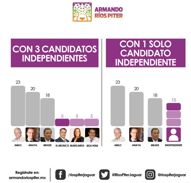 Ríos Piter consideró que de acuerdo a los resultados de las últimas encuestas en la que se maneja la posibilidad de que los tres consigan estar en la boleta de la elección, en las que señala que cada uno tiene un 5 por ciento de preferencias entre la población, lo cual sumado sería de 15 por ciento, contra el 23, 20 y 18 por ciento de Andrés Manuel López Obrador, Ricardo Anaya y José Antonio Meade, respectivamente, podrían dar batalla en las urnas.