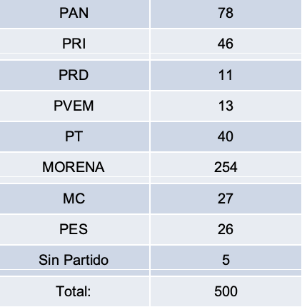 Este sexenio se da de nuevo la alternancia, al ganar la presidencia nuevamente el PRI; sin embargo, obser-vamos que en la Cámara, el PRI se consolida como tercera fuerza con 106 diputados, muy por debajo del PAN como primera fuerza y 206 diputados, permitiendo que diera un contrapeso real al Ejecutivo, diferencian-do a como se legislaba antes.