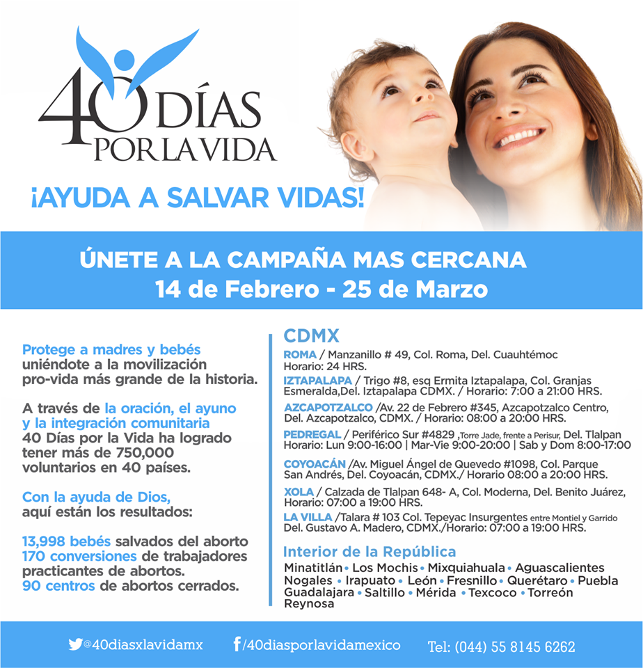 Miles de voluntarios a nivel mundial, en cada campaña, se hacen presentes en vigilia pacífica orando frente a las pseudoclínicas que llevan a cabo la práctica del aborto. En la Ciudad de México, la iniciativa comenzó en 2014, en la sede Roma, frente a las instalaciones de Marie Stopes de la colonia Roma, en la que permanecen día noche y que ahora está en su octava campaña, ya que se realizan dos al año, una en Cuaresma y una a finales de año. En esta primera del 2018, en la Ciudad existen también otras sedes en Azcapotzalco, Coyoacán, Iztapalapa, Pedregal, Xola y La Villa, informó Hugo Rico, Coordinador de la sede Coyoacán.