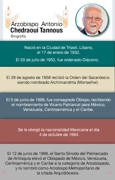 El arzobispo de la Iglesia Ortodoxa de Antioquía, Antonio Chedraoui Tannous, murió esta madrugada a los 85 años de edad, por complicaciones respiratorias. Más tarde la Iglesia Ortodoxa de México confirmó la noticia.