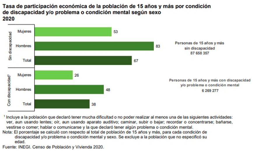 La tasa de participación económica de las personas con discapacidad y/o con algún problema o condición mental de 15 años y más representa 38 por ciento (2.4 millones), cifra que significa poco más de la mita de la que se observa en las personas sin discapacidad, 67 por ciento (59 millones).