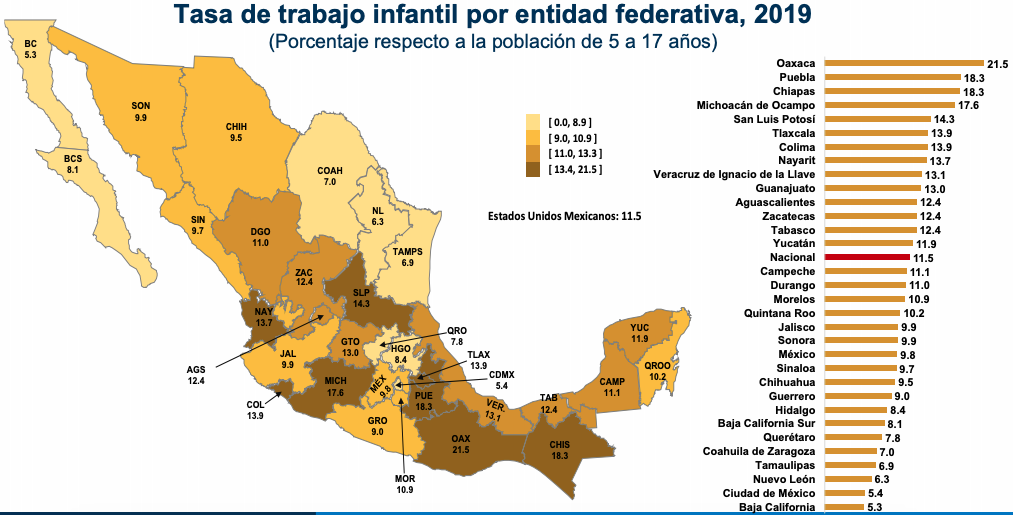 El Instituto de Estadística y Geografía (Inegi), la Secretaría del Trabajo y la Organización Internacional del Trabajo (OIT) presentaron los resultados de la Encuesta Nacional de Trabajo Infantil (ENTI) 2019, la cual arrojó que en el país existen 3.3 millones de niños que trabajan, lo que equivale a una tasa de 11.5 por ciento. Oaxaca, Puebla y Chiapas son los estados donde se registran más niños trabajadores.