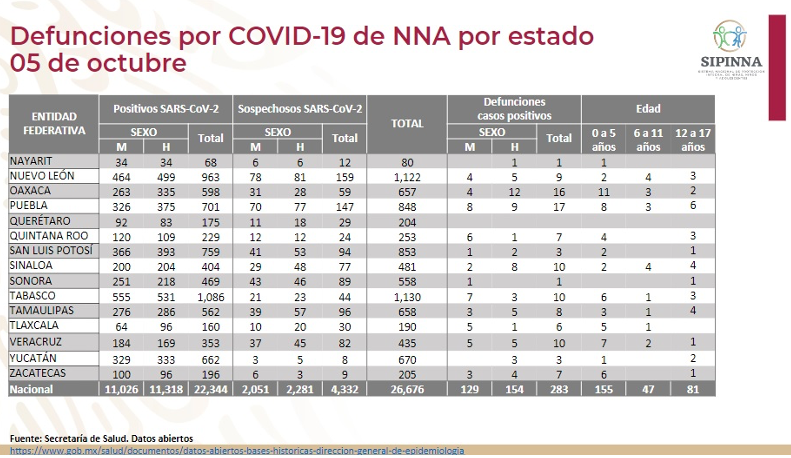 SIPINNA detalla que los 26 mil 809 casos de contagios ocurrieron del 12 de abril al 4 de octubre, la mayoría de estos se dieron en Tabasco con mil 149 casos de menores positivos o sospechosos de haber contraído el virus del coronavirus; Nuevo León con mil 117 casos; San Luis Potosí, 856; Puebla, 845; Tamaulipas, 677; Yucatán, 674; Oaxaca con 650 casos de contagio en menores de edad.