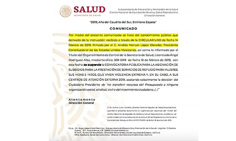 Por medio de un comunicado del Gobierno Federal, encabezado por Andrés Manuel López Obrador y con el conocimiento de Ángel Rodríguez Alba, titular de la Secretaría de Salud, se ha anunciado que los refugios para mujeres víctimas de violencia serán suspendidos, dejando sin atención a las mujeres violentadas y a sus hijos.