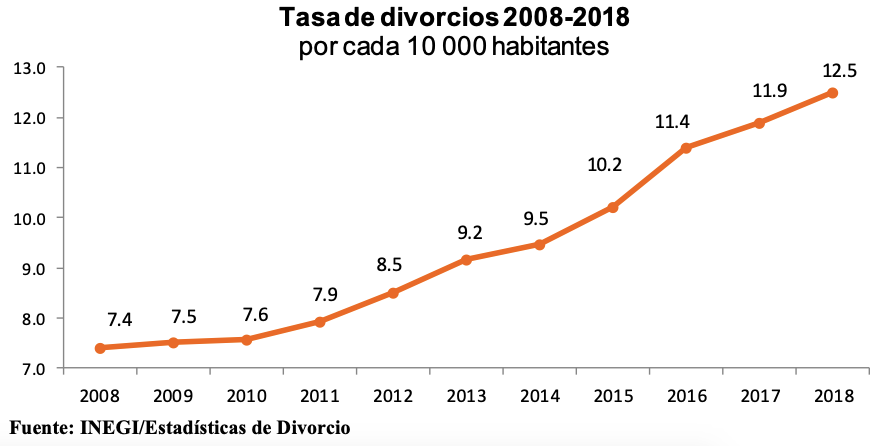 Según datos del INEGI, en 2018 se registraron 156 mil 556 divorcios; 13 mil 968 fueron resueltos por la vía administrativa y 142 mil 588 por la judicial. Las entidades que registraron las mayores tasas de divorcios por cada 100 mil habitantes fueron Nuevo León con 30%; Aguascalientes con 25.4%; Chihuahua con 24.1%, mientras que la tasa nacional fue de 12.5 por ciento.