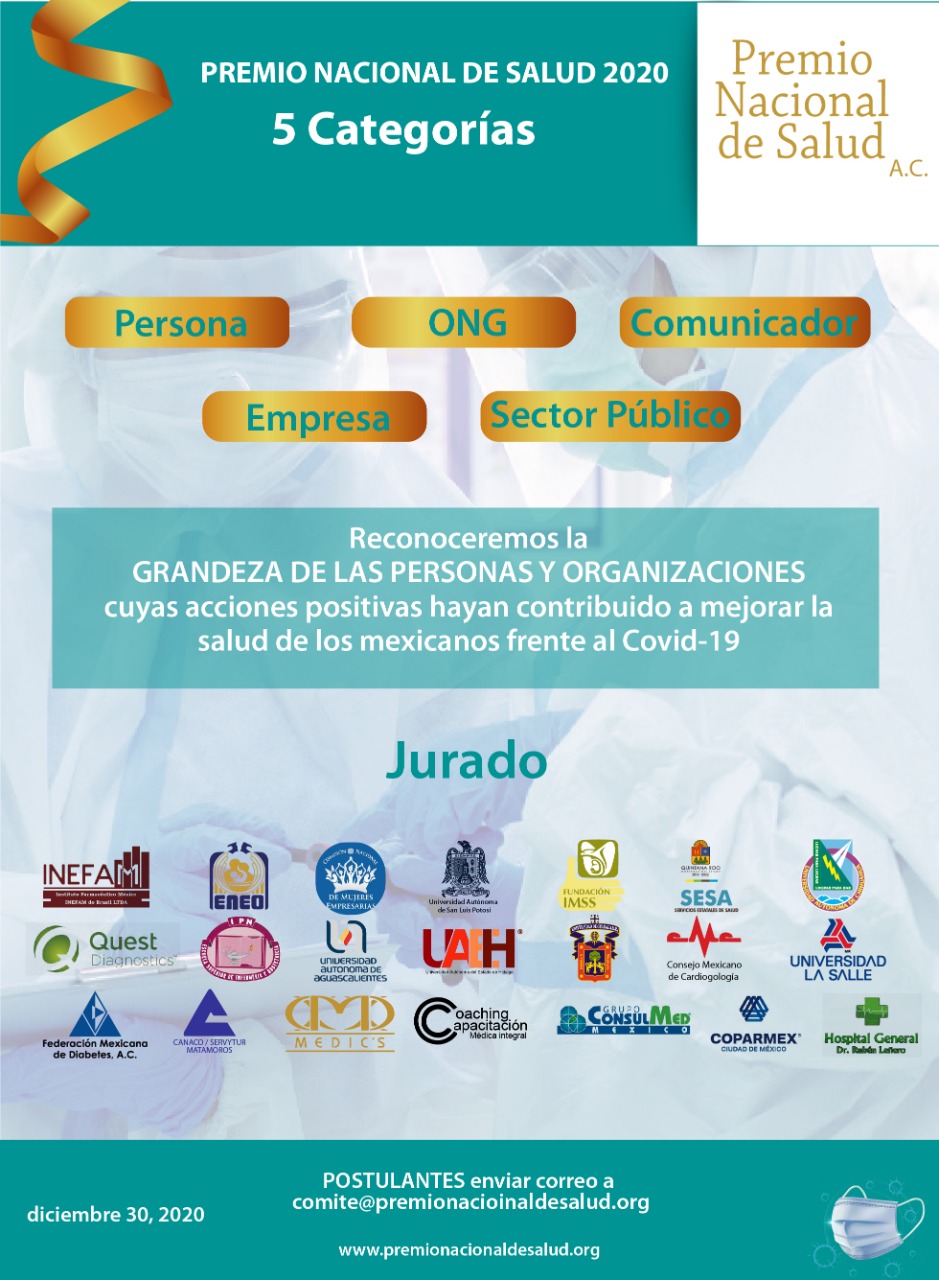 El Premio Nacional de Salud tiene dos convocatorias, la primera es para los participantes en México https://www.premionacionaldesalud.org/pdf/2020/convocatoria-pns2020.pdf y la recepción de candidatos es hasta el 15 de diciembre, tú mismo puedes inscribirte y las categorías son premio a la persona, a la ONG, al comunicador o periodista, a la empresa y a la institución del sector público. Tú mismo puedes inscribirte o inscribir a tu institución en cualquiera de esas categorías o bien, si conoces a alguien que lo haya dado todo por ayudar durante la pandemia, puedes inscribirlo, ingresando en la página www.premionacionaldesalud.org o mandando un correo a la dirección comite@premionacionaldesalud.org