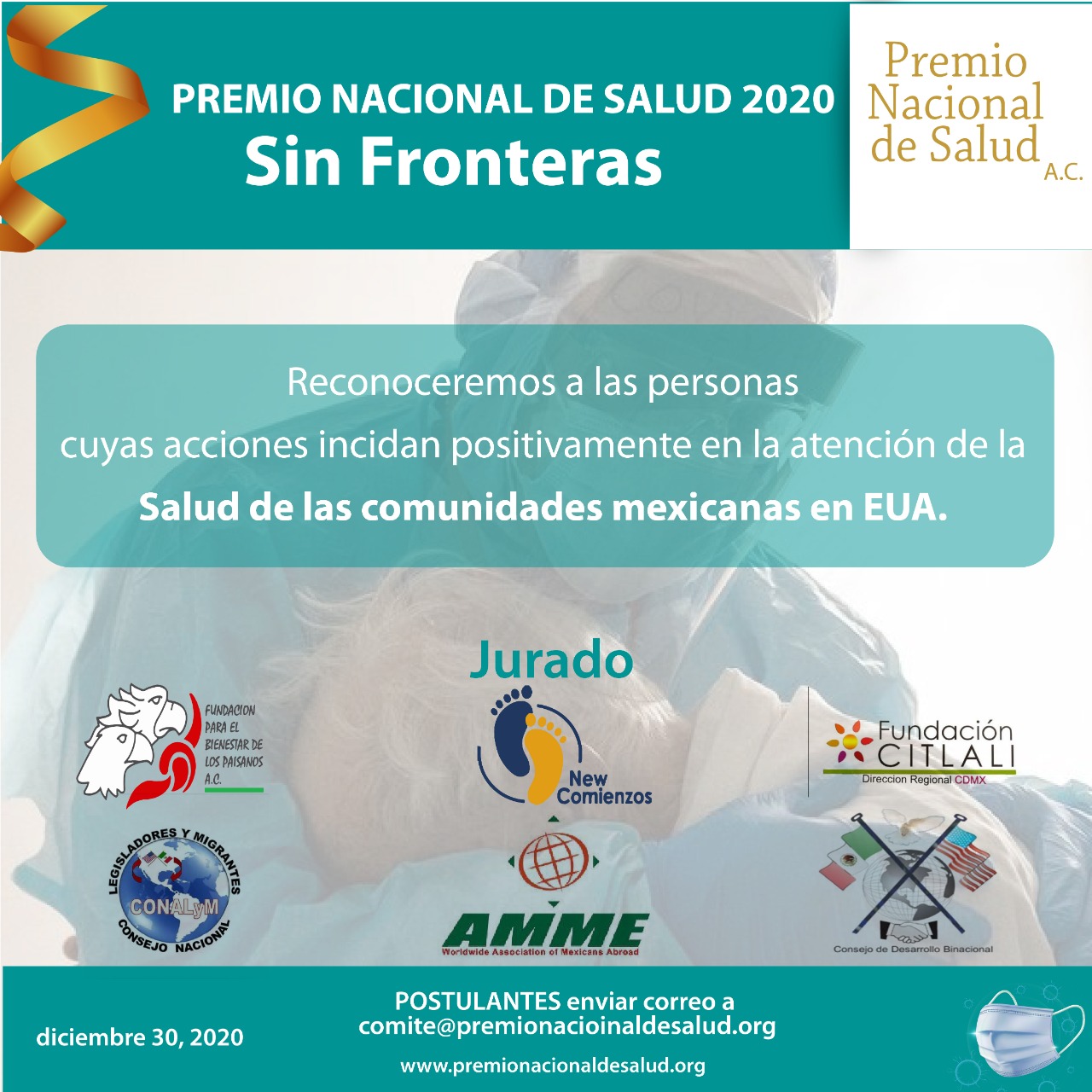 La segunda convocatoria es para el premio “Sin fronteras”, https://www.premionacionaldesalud.org/pdf/2020/convocatoria-pns2020-sinfronteras.pdf que busca premiar a quienes hayan hecho lo posible por cuidar la salud de la comunidad mexicana en el extranjero. En esta convocatoria se entregarán hasta tres reconocimientos y el jurado será diferente al de la convocatoria para mexicano, los jueces serán en su mayoría representantes de organizaciones o instituciones de apoyo a migrantes. Para inscribirte o inscribir a alguna persona destacada o institución tienes hasta el 20 de diciembre y lo puedes hacer en la página www.premionacionaldesalud.org o mandando un correo a la dirección comite@premionacionaldesalud.org