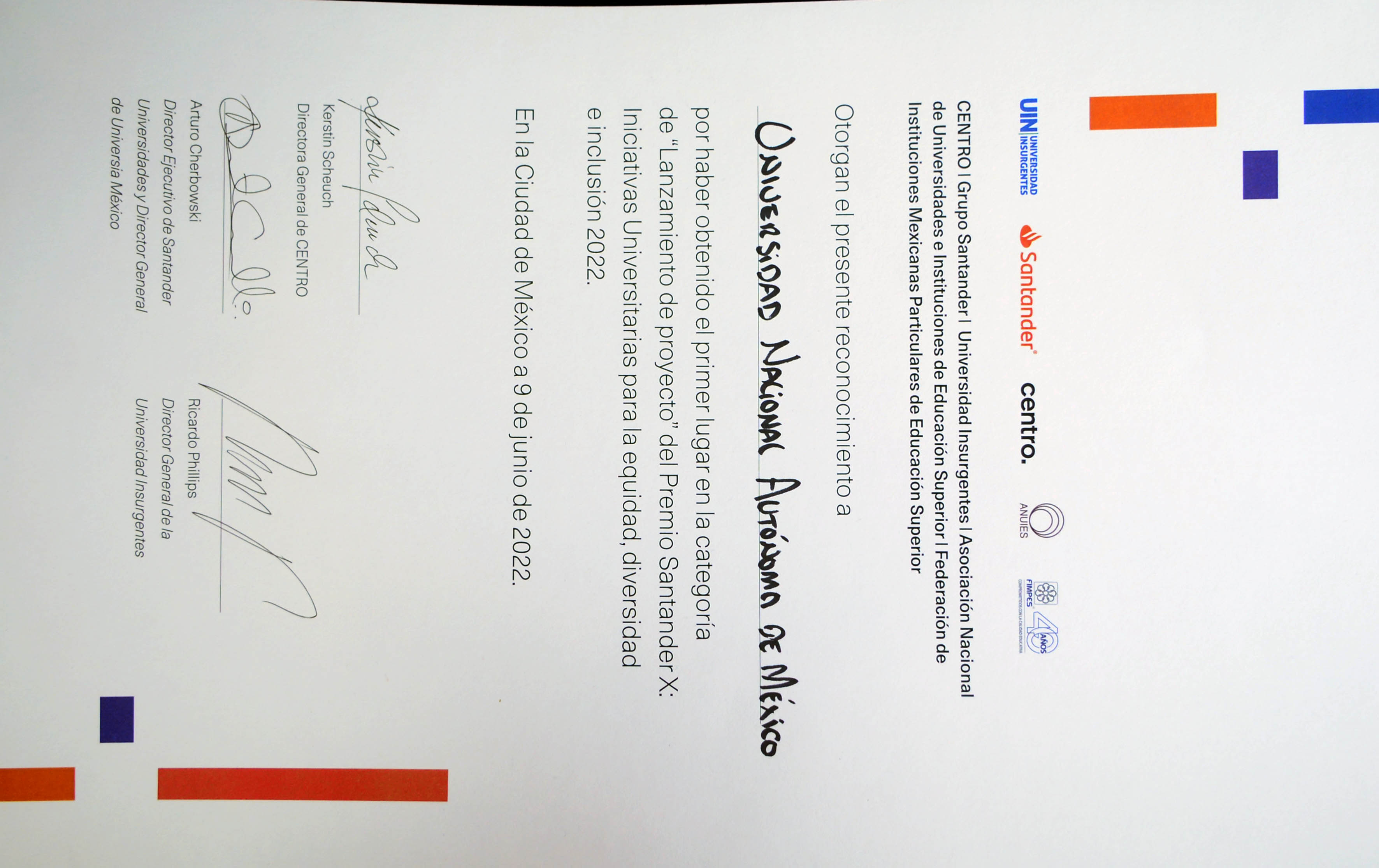 Al ganar el “Premio Santander X: Iniciativas universitarias para la equidad, diversidad e inclusión 2022”, la Unapdi de la UNAM recibió un diploma y un apoyo económico de 150 mil pesos para que se puedan llevar a cabo siete cursos que beneficiarán a estudiantes discapacitados de la máxima casa de estudios.