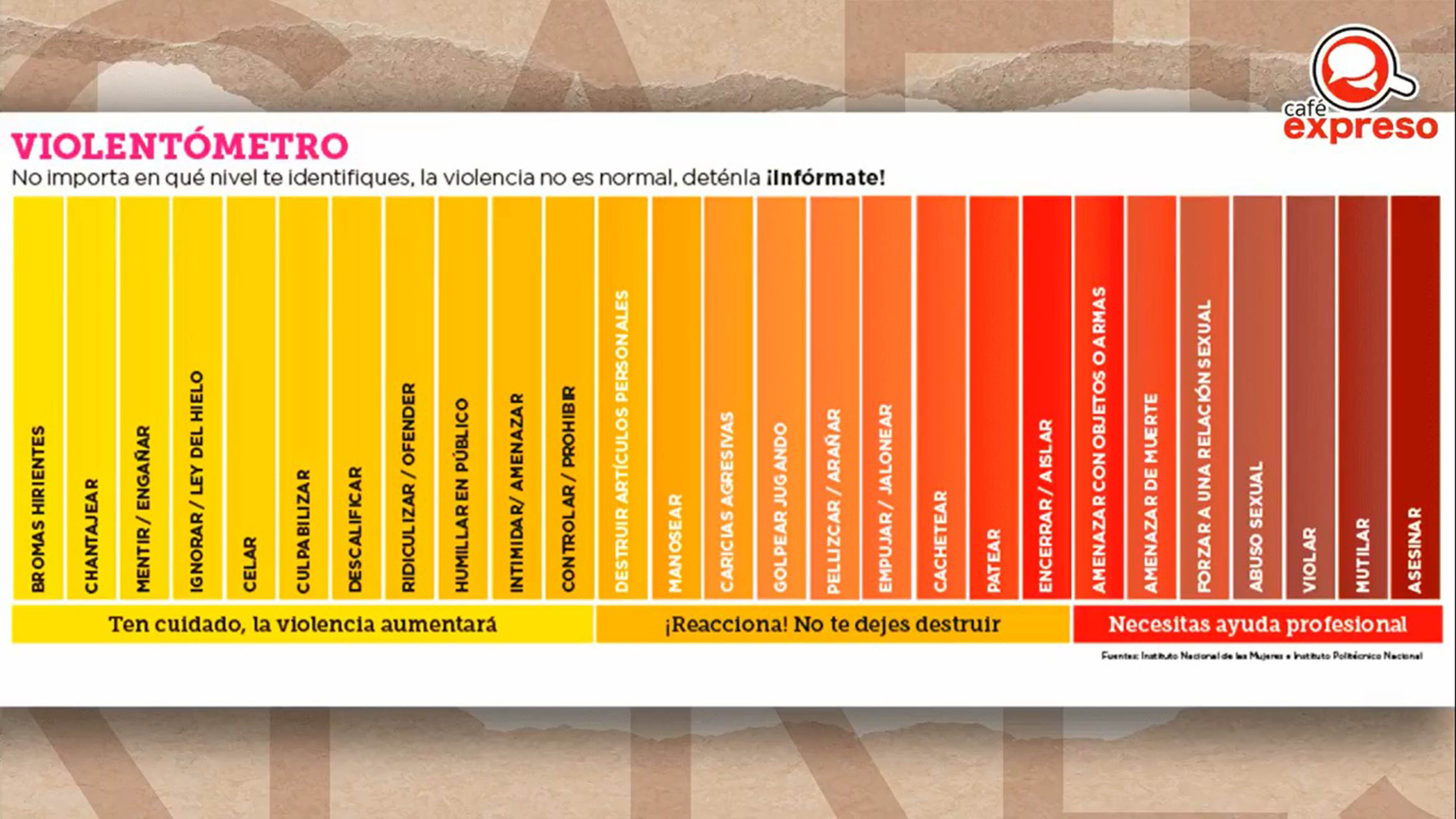 La experta también manifestó que conductas como el chantaje, la mentira, aplicar la “ley del hielo”, celar, culpabilizar, intimidar y controlar a la pareja, inician ligeramente, con bromas ligeras, que después se intensifican y se convierten en alertas en una relación, esas conductas forman parte de un violentómetro.