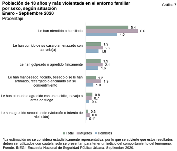 De acuerdo con el tipo de violencia que padecieron, de enero a agosto de 2020, se estima que 5.4 por ciento de las personas de 18 años y más, en zonas urbanas, fueron violentadas con ofensas o humillaciones por parte de algún miembro de su hogar. En mujeres este porcentaje fue de 6.6 por ciento, mientras que en hombres de 4.0 por ciento.