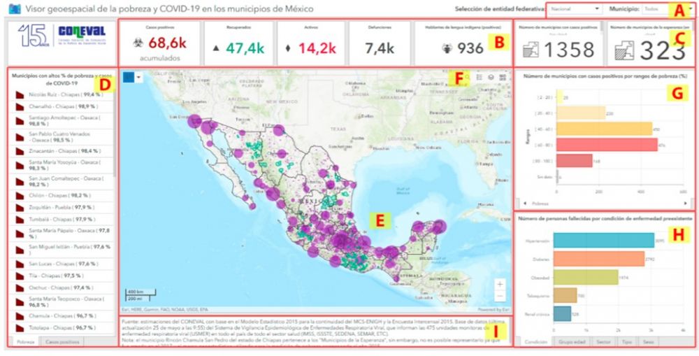 Para facilitar a las autoridades reconocer los patrones del comportamiento de la pandemia e identificar los territorios más afectados por el COVID-19 y con base en ello llevar a cabo acciones para ayudar a la población a fin de enfrentar la pandemia, el Consejo Nacional de Evaluación de la Política de Desarrollo Social (Coneval) desarrolló el Visor Geoespacial de la Pobreza y la COVID-19 en los municipios de México.