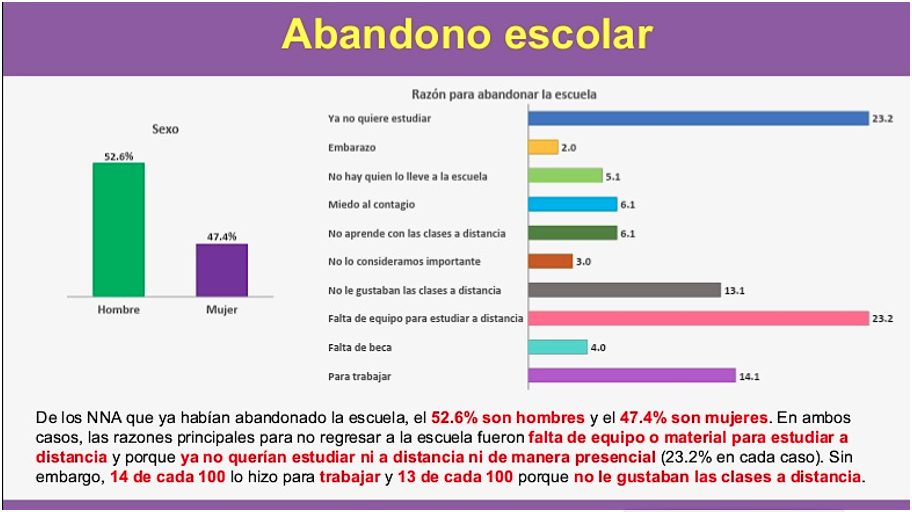 Mencionó que la SEP no ha implementado un sistema de búsqueda y localización de estudiantes que no regresaron a las escuelas; sin embargo, un cálculo inicial estima que podría ser más de dos millones de niñas, niños y adolescentes que por diferentes razones han abandonado los estudios.