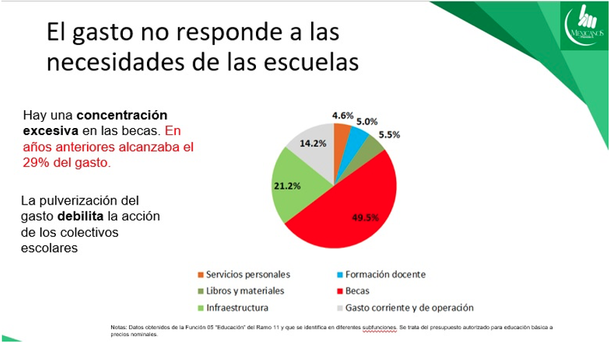 Consideró que el gasto del propuesto no corresponde a las necesidades en las escuelas porque está concentrado en becas y deja fuera recursos para la reconstrucción de escuelas, insumos e instalaciones que permitan la permanencia segura de niñas, niños y jóvenes en las escuelas, que es lo que en realidad restituye el derecho a la educación.