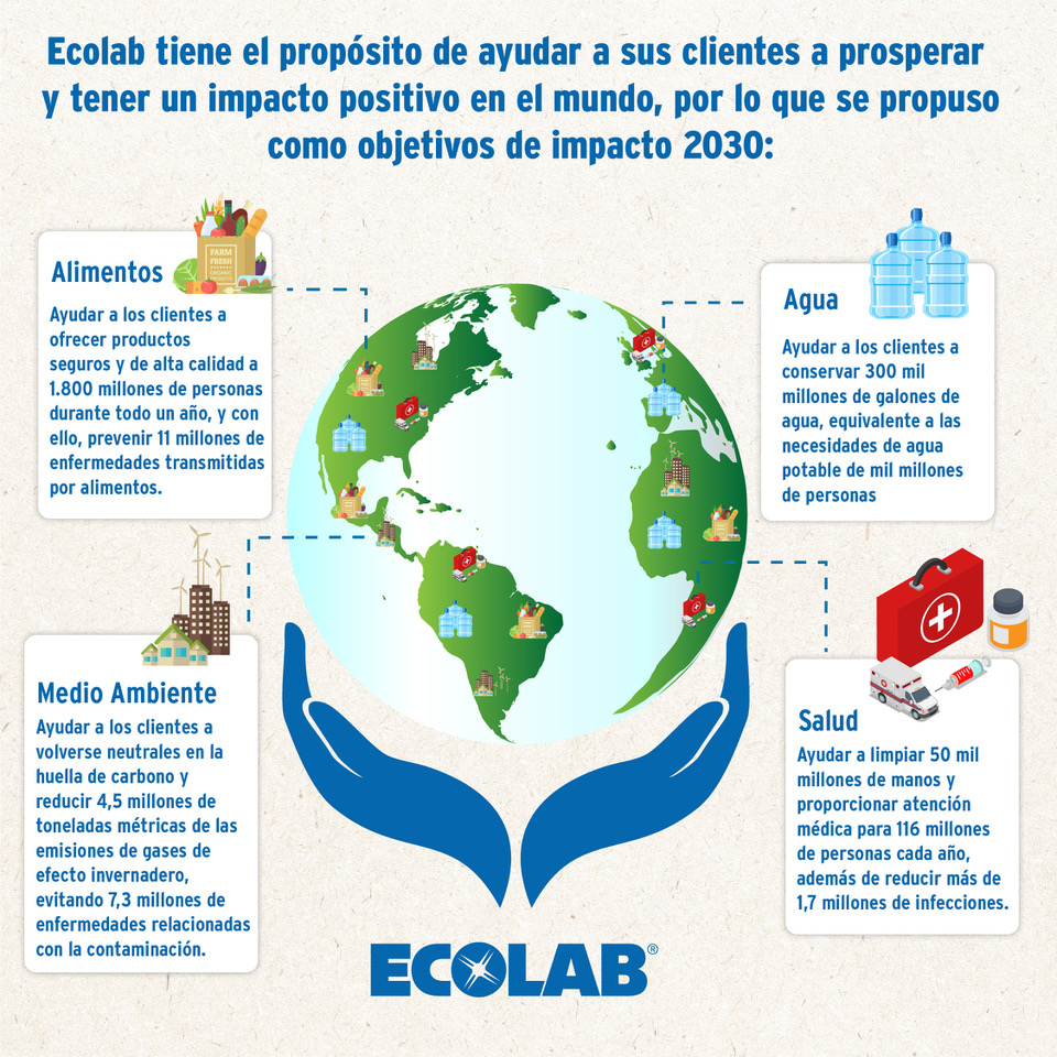 Los objetivos 2030 de Ecolab son conservar 780 mil millones de galones de agua al año, convertir el impacto de carbono reduciendo 4.5 millones de toneladas métricas de emisiones de gases de efecto invernadero, proporcionar alimentos seguros y de alta calidad a 1,800 millones de personas, y limpiar 50 mil millones de manos y brindar atención médica segura a 116 millones de personas cada año.