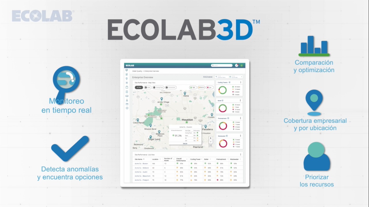 “ECOLAB3D es un motor digital basado en la nube que incorpora el internet de las cosas, la inteligencia artificial y analítica avanzada de datos para traducir información de fuentes múltiples al interior de instalaciones”, aseguró Ecolab y destacó que esos datos son para optimizar el trabajo de centros de manufactura de alimentos y bebidas, fábricas y hospitales, para el ahorro de agua y energía, al mismo tiempo que se aumenta la productividad.