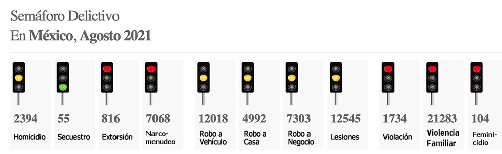 De acuerdo con la organización Semáforo Delictivo, en agosto de 2021, México reporta cinco delitos en color rojo, cinco en amarillo y un crimen en color verde. De los delitos en color rojo, dos están relacionados con el crimen organizado: extorsión y narcomenudeo; tres son socio-familiares: violación, violencia familiar y feminicidio.