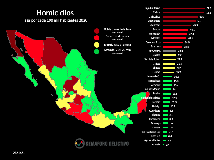 Los estados con las tasas más altas de homicidio son: Baja California con 73, Colima con 72, Chihuahua con 61, Guanajuato con 57 y Zacatecas con 40; los estados con las mejores tasas son Yucatán con 2.4, Aguascalientes con 5.5, Coahuila 6.4 y Baja California Sur con 7.7.