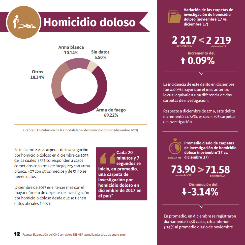 En el Reporte sobre delitos de alto impacto correspondiente a diciembre de 2017, el organismo indicó que “en la descomposición de las relaciones de convivencia, “sorprende ver la diferencia de cómo se conducen esos funcionarios que salieron hace cinco años a autoaplaudirse los descensos (que iniciaron en la pasada administración), cómo presumieron eficacia gracias a la coordinación y al uso de inteligencia y que hoy no rinden cuentas, apenas reconocen tímidamente los aumentos y eventualmente descargan responsabilidades”.