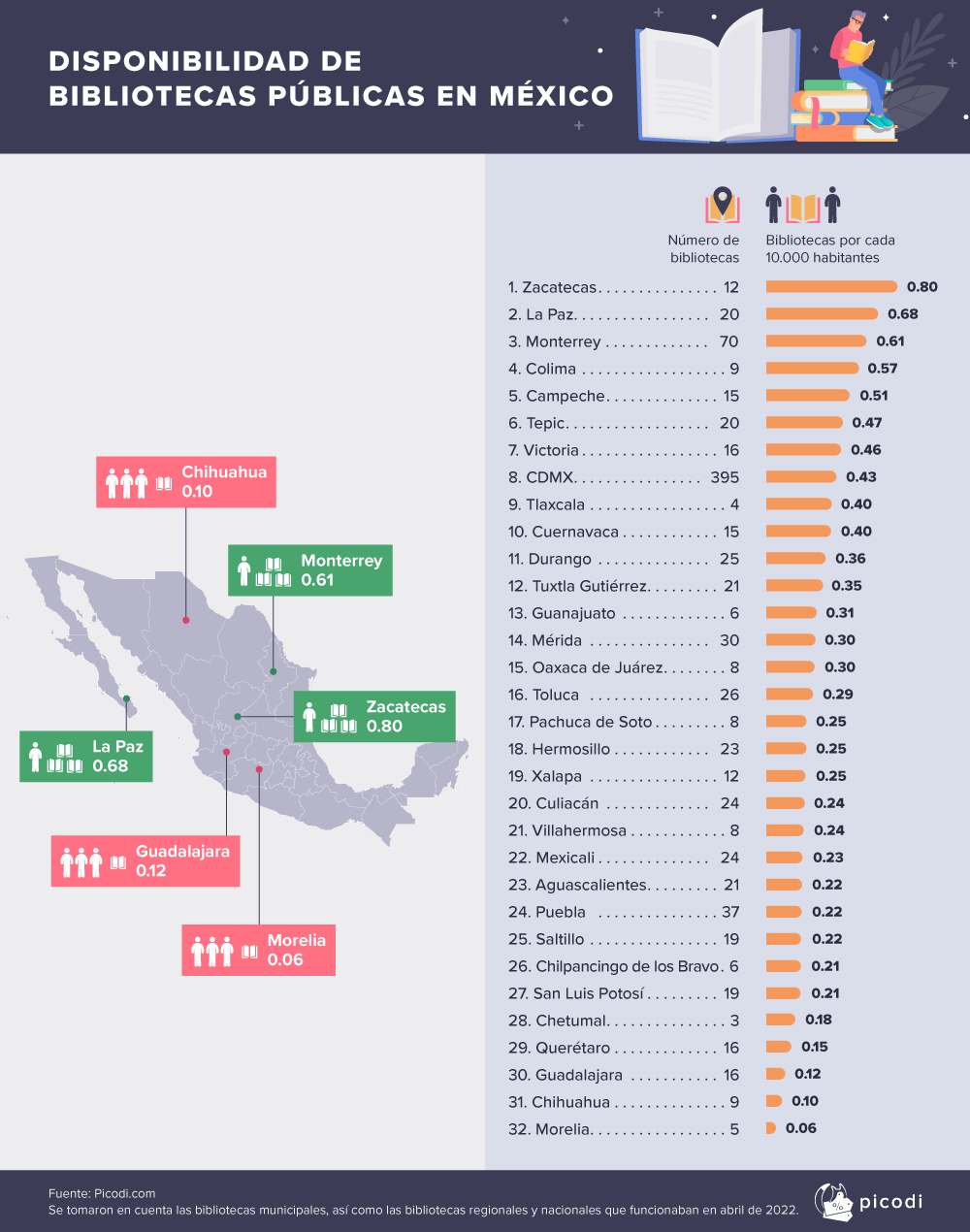 Picodi también hizo un análisis específico de México y sus ciudades y destacó que la capital con la relación más favorable entre el número de bibliotecas y el número de habitantes es Zacatecas, Zacatecas, tiene 12 bibliotecas y casi hay una biblioteca (0.80) por cada 10 mil habitantes. Zacatecas tiene aproximadamente 405 mil habitantes.