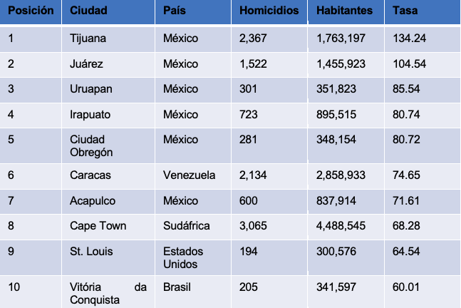 Según la institución, las tasas tan altas actuales de homicidio en México “sólo se observaron en ciudades como Medellín y Cali (Colombia), a finales de los años 80 e inicios de los 90, cuando los narcotraficantes escalaron al máximo su guerra contra el Estado” y detalló que, en 2021, México fue el país con más ciudades violentas del ranking, registrando 18 de 50.
