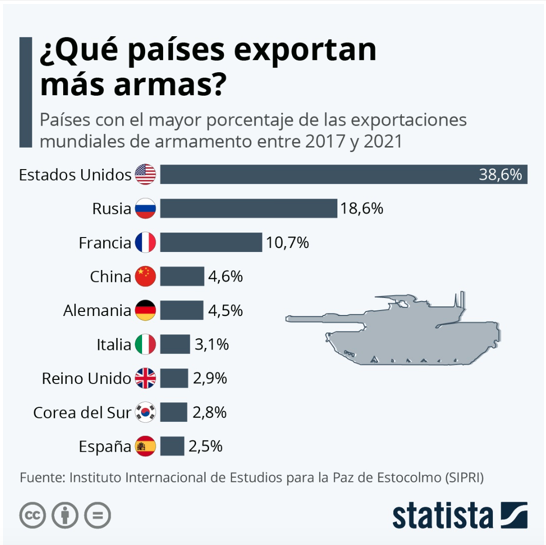 Según el Instituto Internacional de Estudios para la Paz de Estocolmo (SIPRI), Estados Unidos sigue siendo el mayor exportador de armas del mundo. Este país es responsable de casi un 39 por ciento de las ventas internacionales de armamento entre 2017 y 2101, frente al 32 por ciento entre 2021 y 2016.